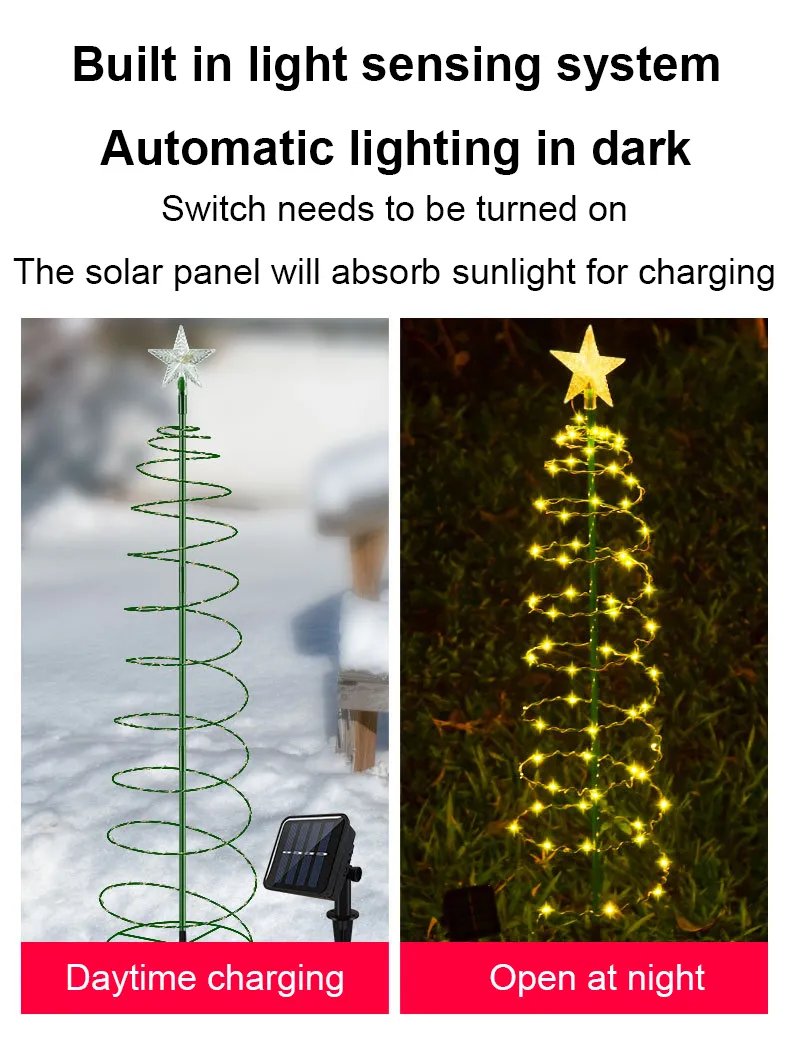 This solar LED Christmas tree light decoration will turn on automatically each night and off during the day to charge. With no wires, batteries, or timers required, the setup is quick and easy. Enjoy your holiday the Eco-friendly way.