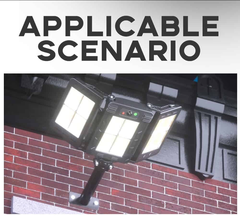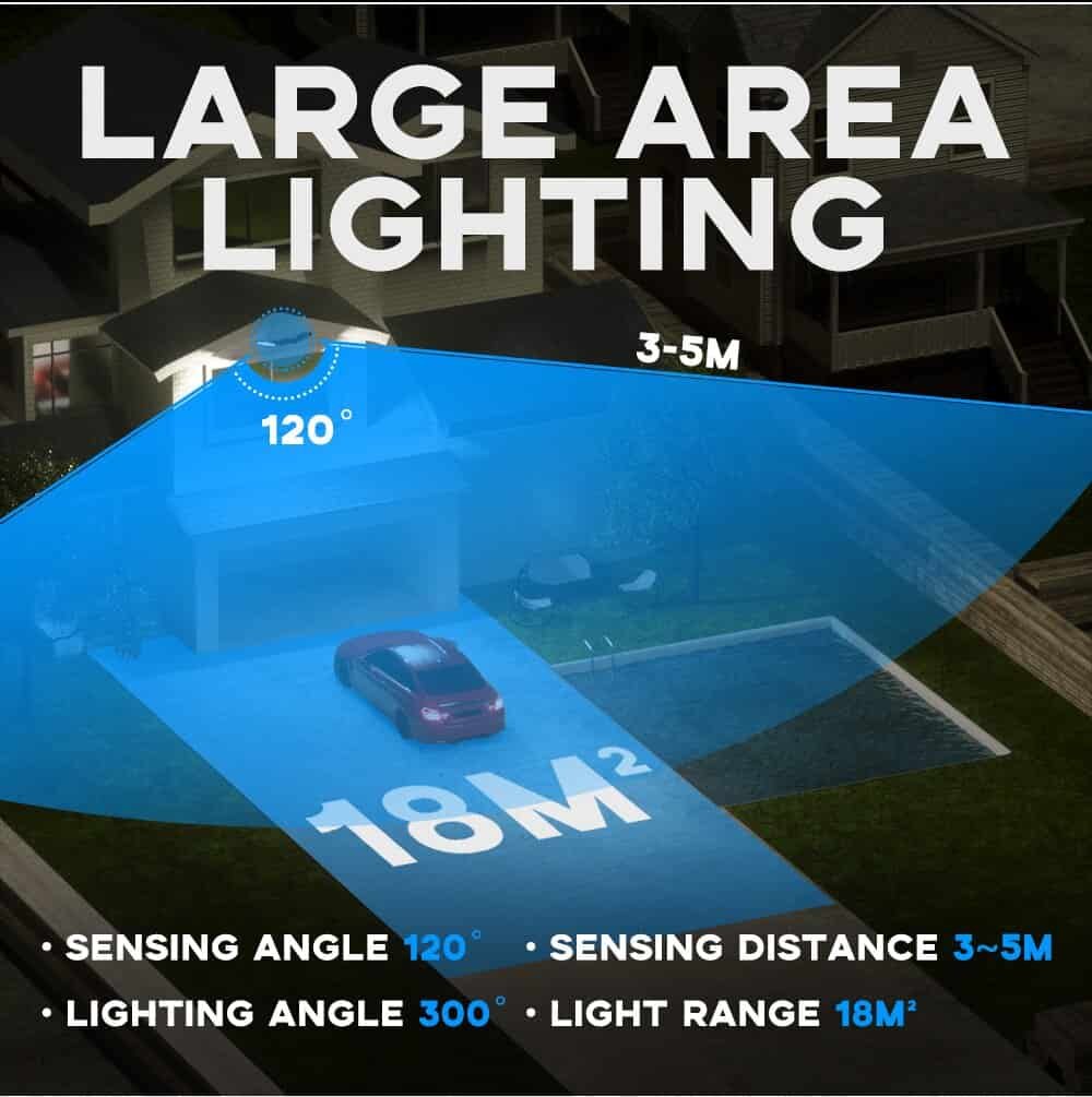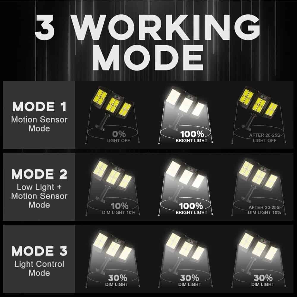 The solar security light outdoor build in 3000mAh rechargeable lithium-ion battery allows the solar lamp to be continuously illuminated for longer lighting. The solar panels work daytime to store electricity and it can work in Motion sensor mode for 12 hours at night.