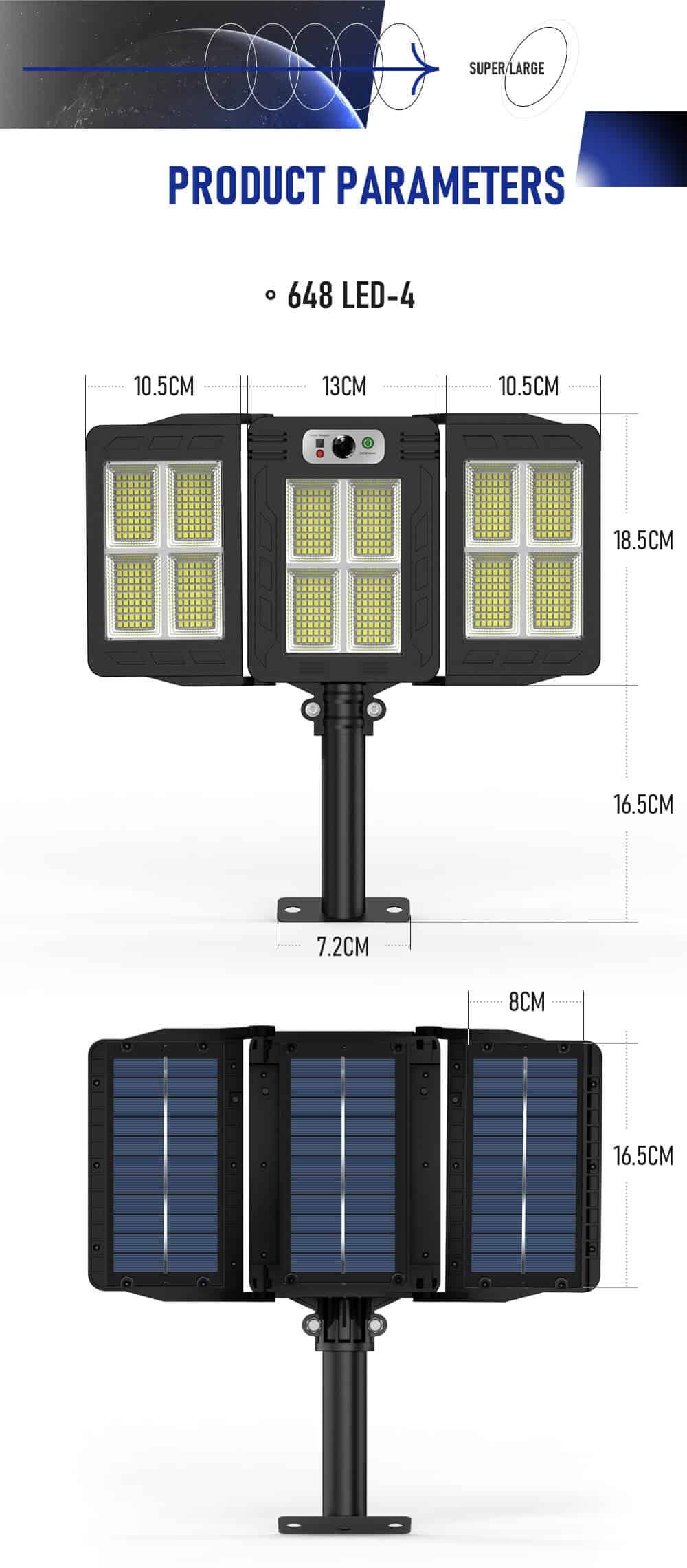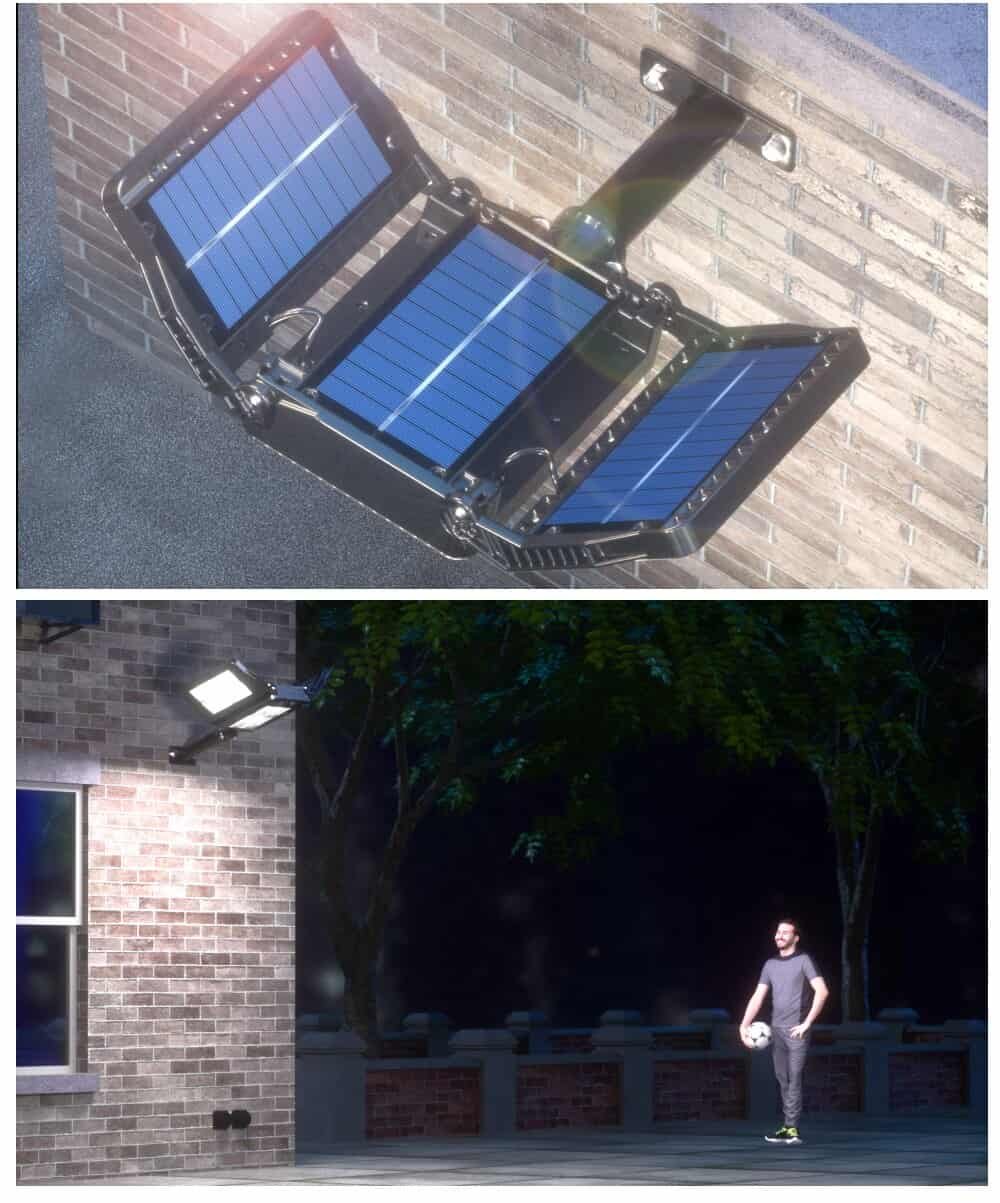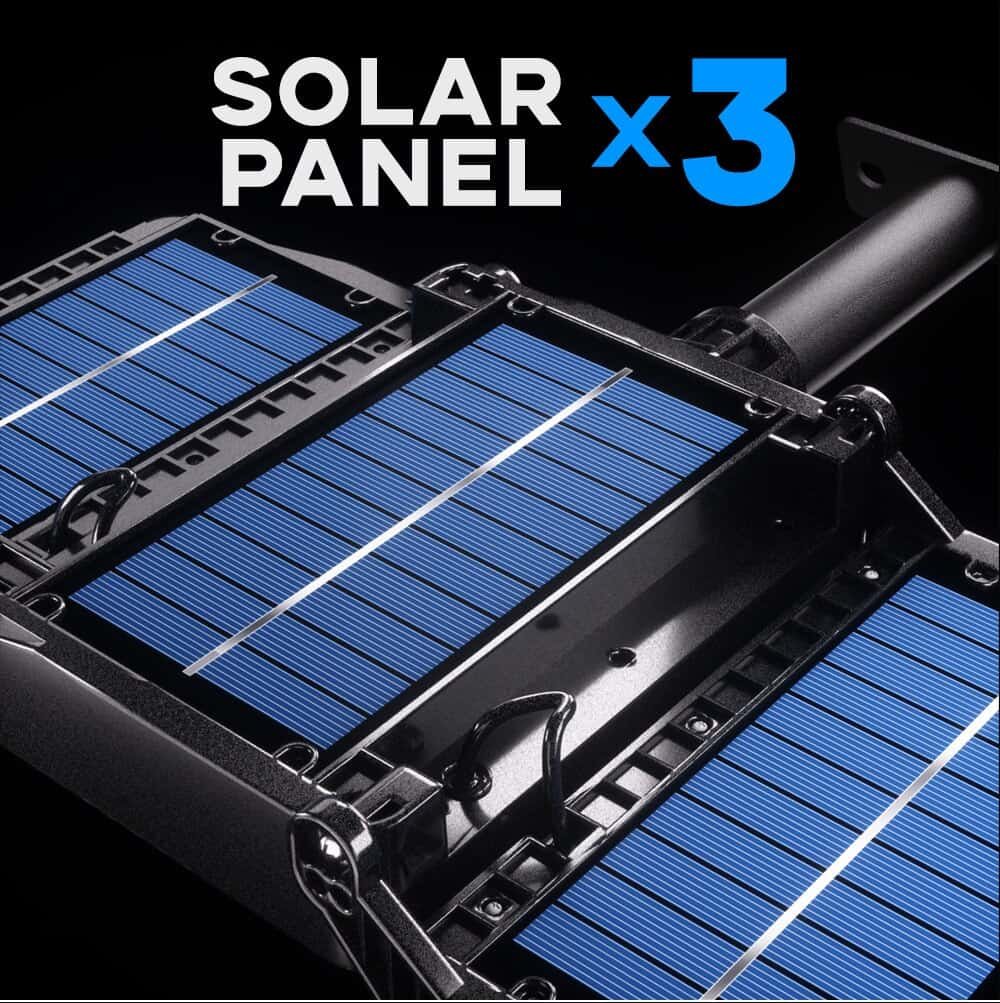 The solar security light outdoor build in 3000mAh rechargeable lithium-ion battery allows the solar lamp to be continuously illuminated for longer lighting. The solar panels work daytime to store electricity and it can work in Motion sensor mode for 12 hours at night.