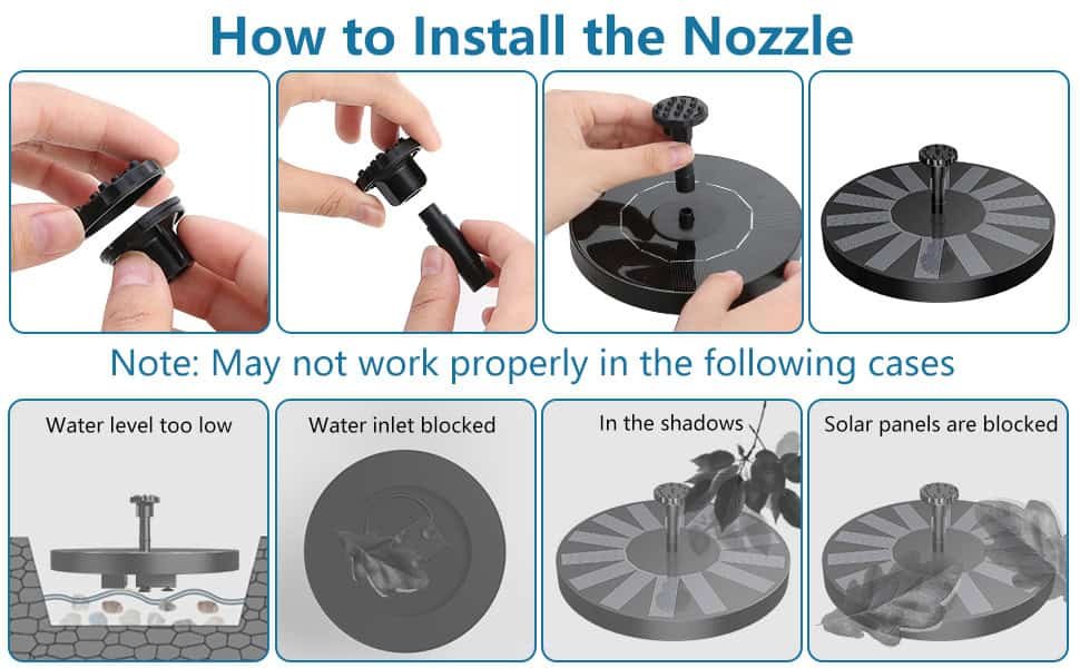 Precautions for use: Make sure the water pump can be completely submerged underwater and the solar panels are fully exposed to sunlight, and the solar panel has no leaves or other obstructions to shade. Please clean the water pump and nozzle regularly to prevent the water pump from being blocked by dust or covered by leaves.